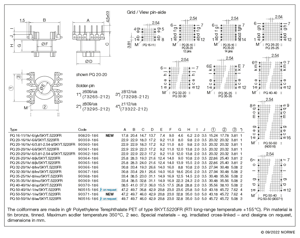 PQ 16 bis PQ 50 Spulenkörper mit Lötstiften