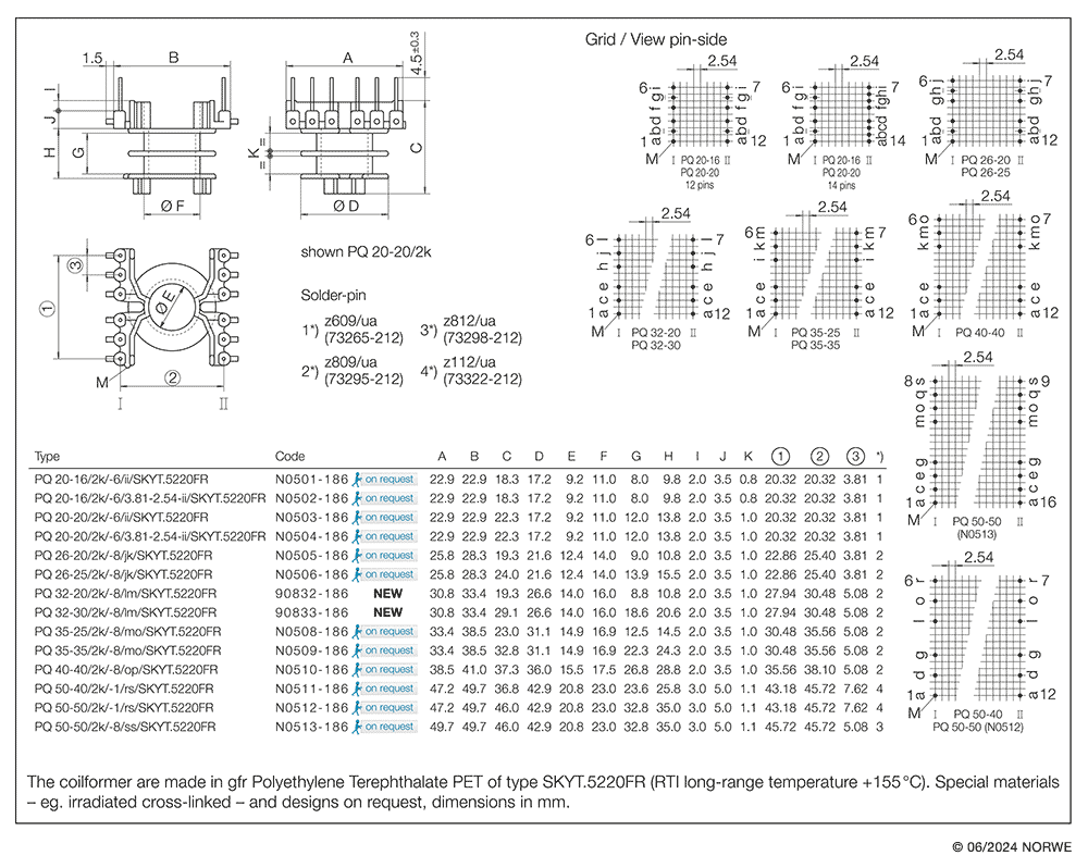 PQ 20 bis PQ 50 Spulenkörper in Zweikammer-Version mit Lötstiften