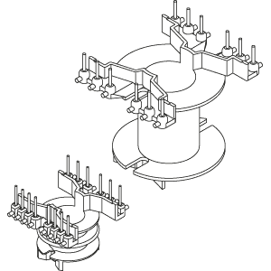 Die Spulenkörper mit vertikaler Achse eignen sich zur Verarbeitung auf modernsten, numerisch gesteuerten Wickelmaschinen. Linear angeordnete Lötstiftreihen in Verbindung mit radialen Umwickelzapfen gewährleisten eine zugentlastete, axiale Anwicklung. Abstandsfüße zur Printplatte stellen sicher, dass Blindlötungen durch abgedeckte Printlöcher vermieden werden.